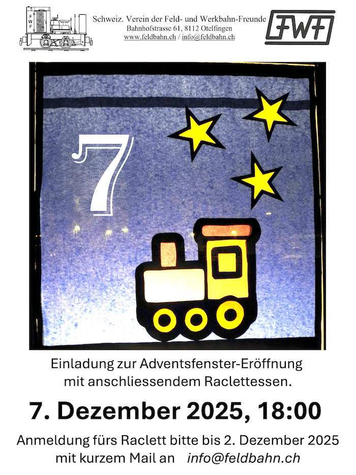 Wir machen dieses Jahr wieder bei den Adventsfenster teil und eröffnen unser Fenster am Sonntag, 7. Dezember um 18 Uhr. Kommen Sie zur Eröffnung vorbei auf ein Glühwein. Zudem bieten wir auch ein Racletteessen in ungewöhnlichem Ambiente an, Anmeldung bitte an info@feldbahn.ch.
